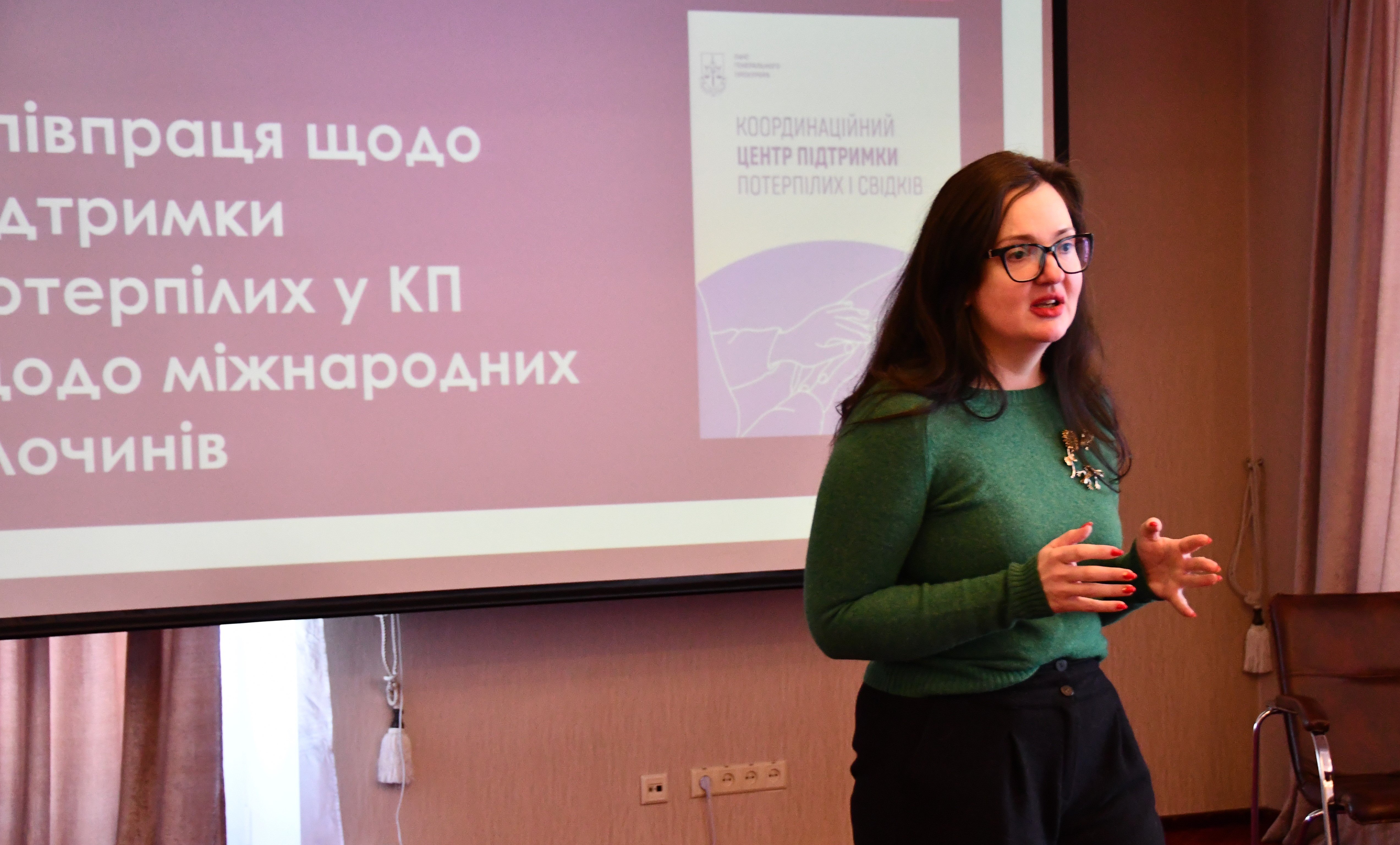 Вероніка Плотнікова розповіла, що в Україні підтримка потерпілих у кримінальних провадженнях щодо міжнародних злочинів здійснюється координаційними центрами підтримки потерпілих і свідків як окремного структурного підрозділу Офісу Генерального прокурора, а також координаторами з підтримки потерпілих і свідків. Метою центрів є забезпечення можливості для свідків і потерпілих повної та дієвої участі у кримінальних провадженнях, надійного їх захисту від повторної віктимізації (як жертви злочину), залякувань і помсти, а також має на меті поліпшити захист свідків і потерпілих від нанесення їм психологічної та фізичної шкоди, підвищити рівень їхньої обізнаності про свої права, покращити для них доступ до правосуддя та послуг з підтримки тощо.