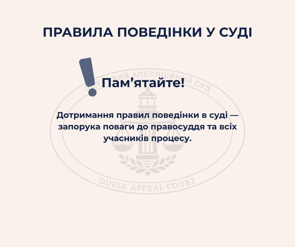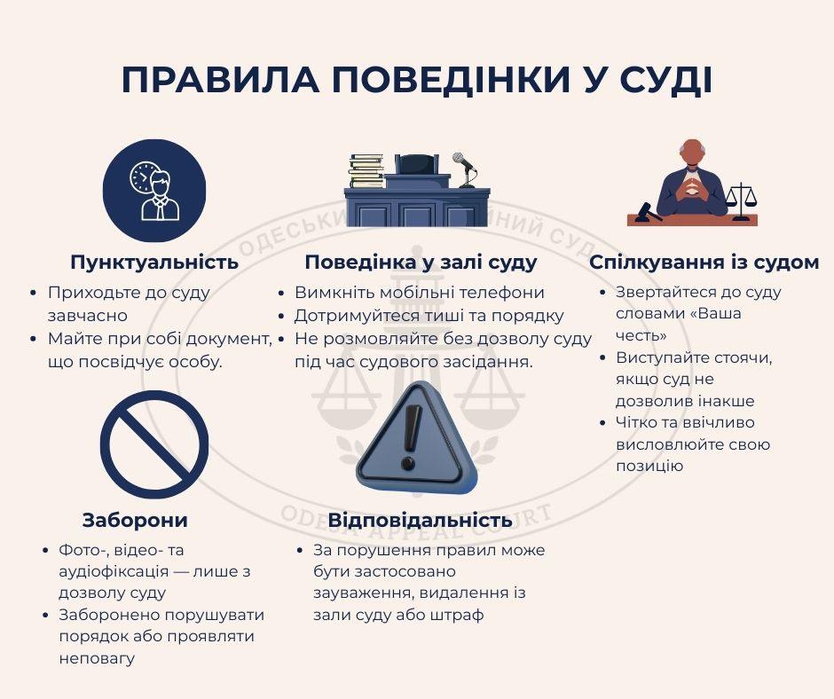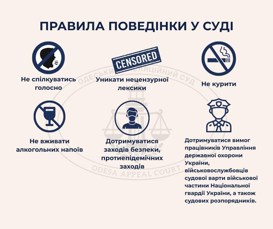 З метою інформування відвідувачів та учасників судових процесів про основні правила поведінки у суді Одеський апеляційний суд підготував наочну інфографіку.